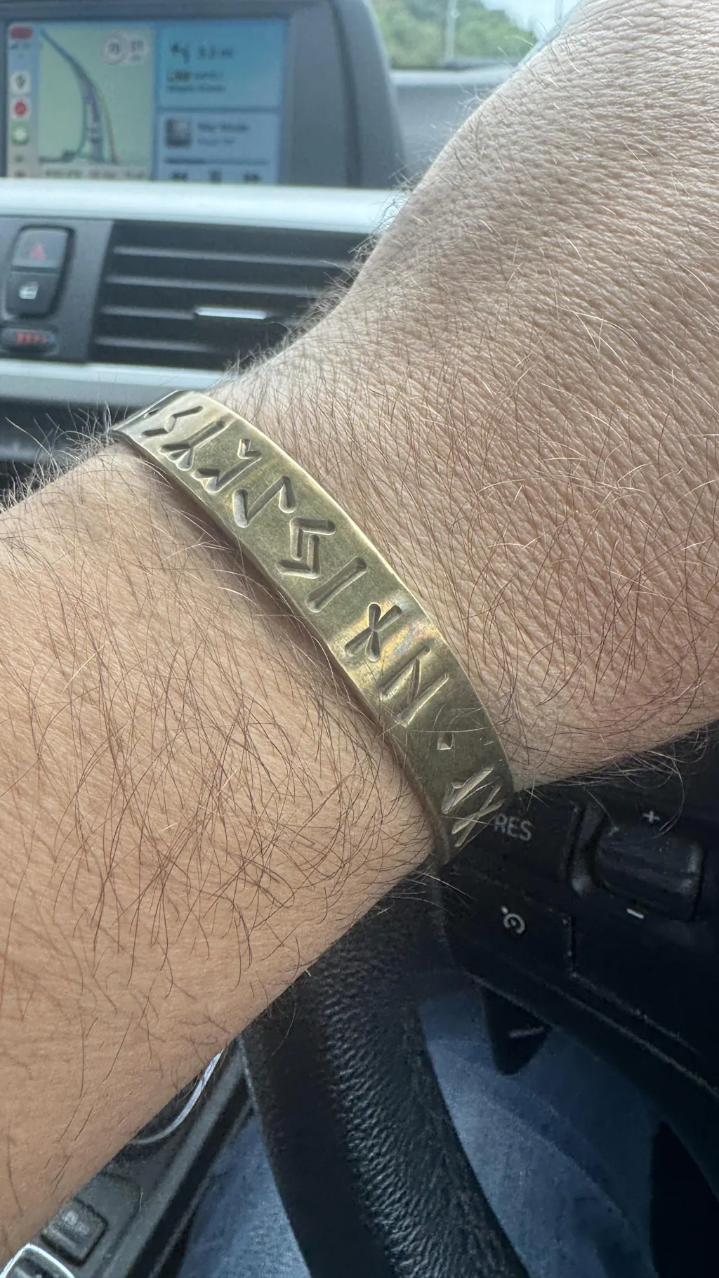 Wikinger-Armband aus massivem Messing mit Runeninschrift.