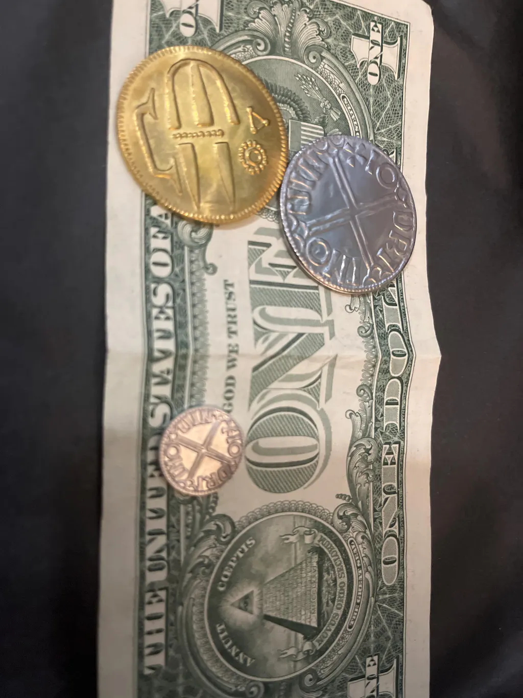 Große Repliken von Wikingermünzen in Silber- oder Goldfarbe.