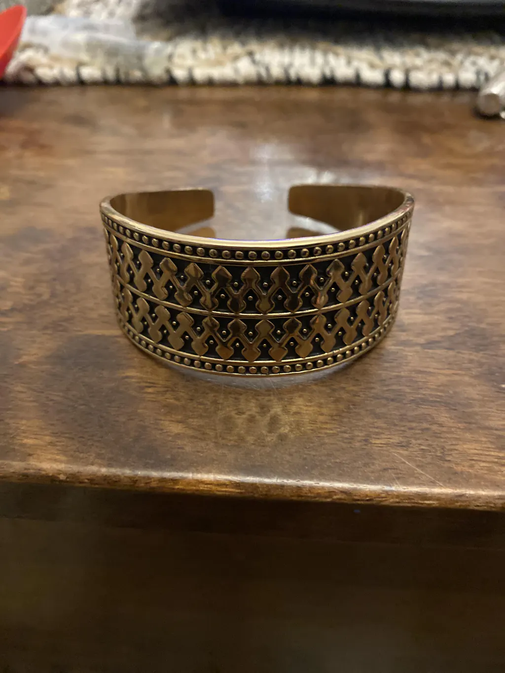 - An intricate pattern around most of the bracelet with embossed angular recesses, 1 dot in each recess and a band of dots around each rim.