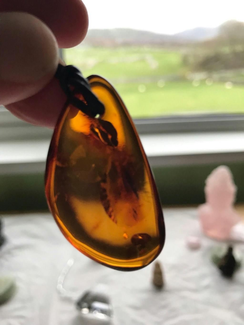 Made from cut and polished pieces of genuine Baltic amber with a 2mm hole drilled for suspension and complete with leather thong to hang it from. Individually handmade from natural amber, so shape, size and colour will vary. Each one is unique! and made especially for us.