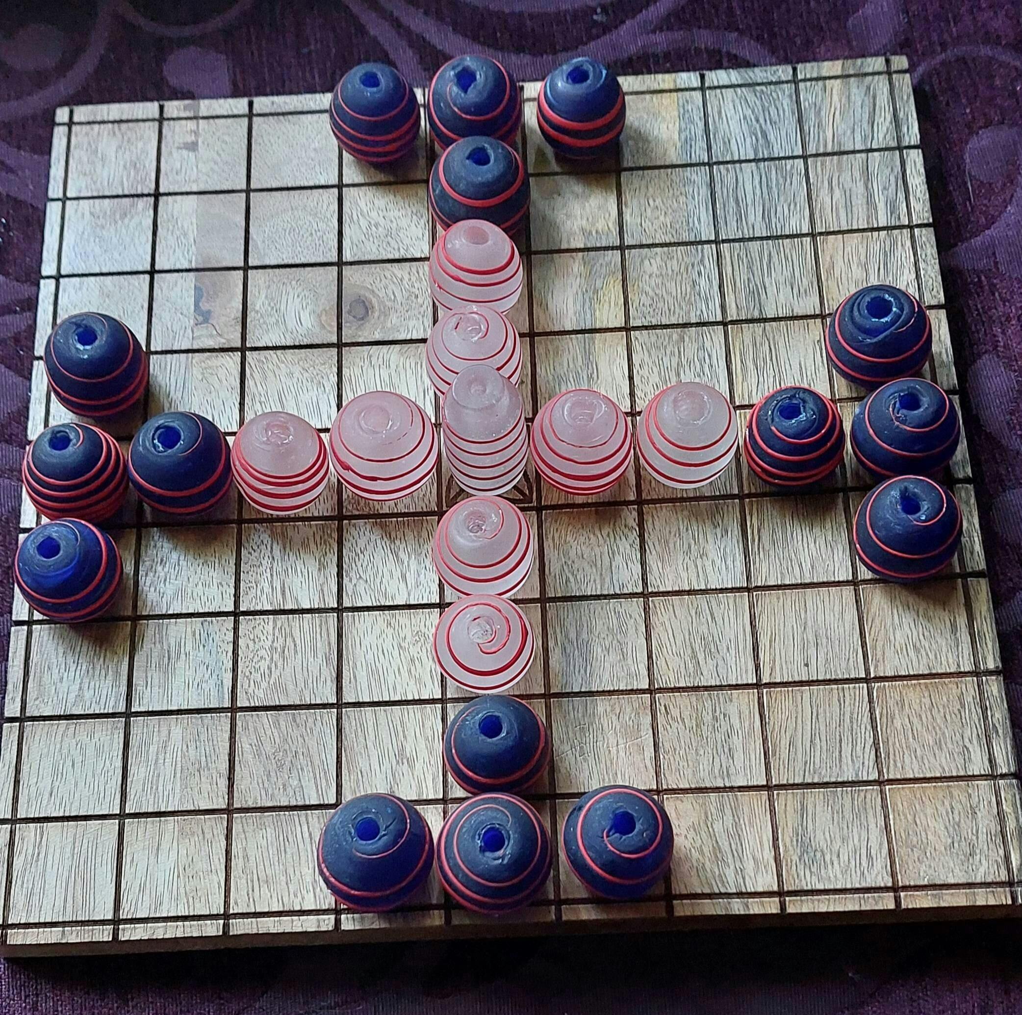 Players take it in turns moving any one of their hnefatafl pieces either horizontally or vertically around the board. Pieces are taken (removed from play) by having one of your pieces on either side of an opponent's piece, thus eliminating it. The king can only be taken by having attacking pieces to all four sides. The corner squares count as opponent's pieces for the purpose of taking pieces, thus a piece that is next to a corner square needs only to have an opponent's piece placed next to it (opposite the corner square) to be taken.
